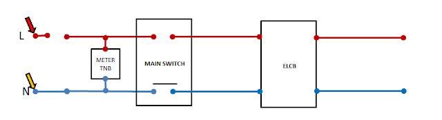 dibawah ini adalah lakaran panel bekalan kuasa dirumah 1 fasa. Ianya terdiri dari cut out fius (biasanya 60A), meter elektrik, suis utama (biasanya 40A bergantung kepada rumah), ELCB (biasanya 40/01A/2P) dan kotak pembahagi (tidak dimasukkan dalam rajah) .